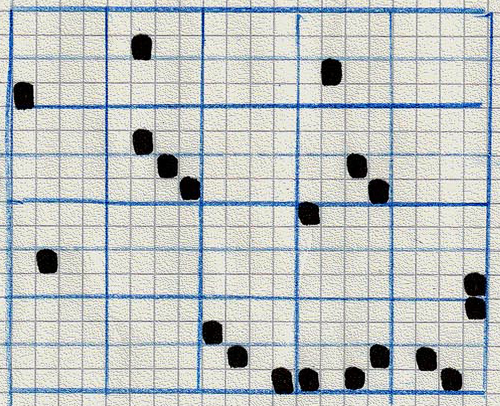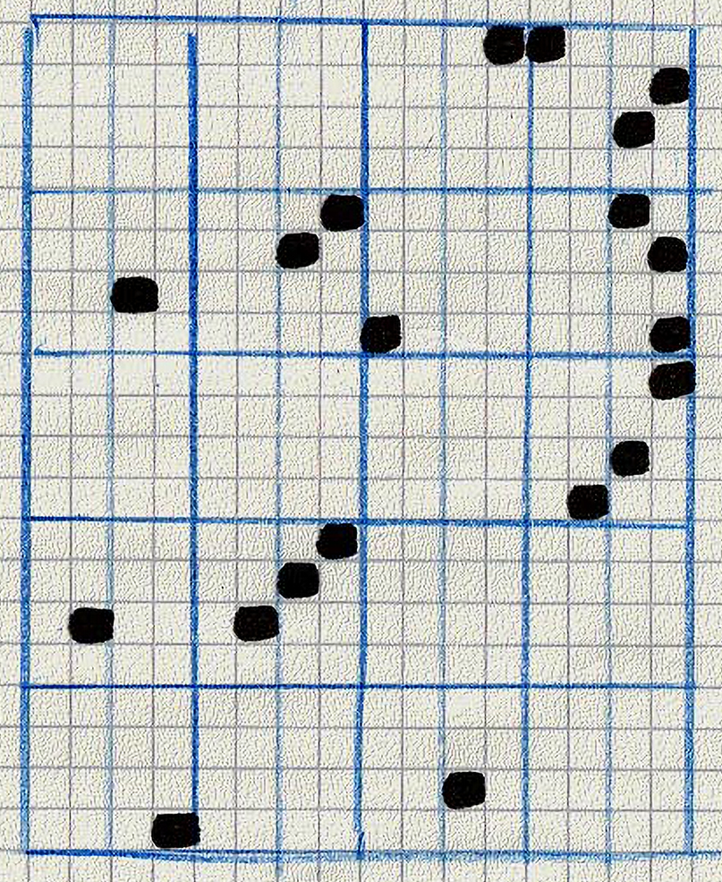 In Journal episode 9, I described a compositional process I began exploring in the 1980s. Inspired by Larry Austin’s groundbreaking Canadian Coastlines, I began tracing natural patterns onto graph paper. Particular points on the graph yielded 2-dimensional coordinate values that could be interpreted as timing and pitch information. The first patterns were shorelines, making the initial sketches for PENINSULA (1984, TC-50).