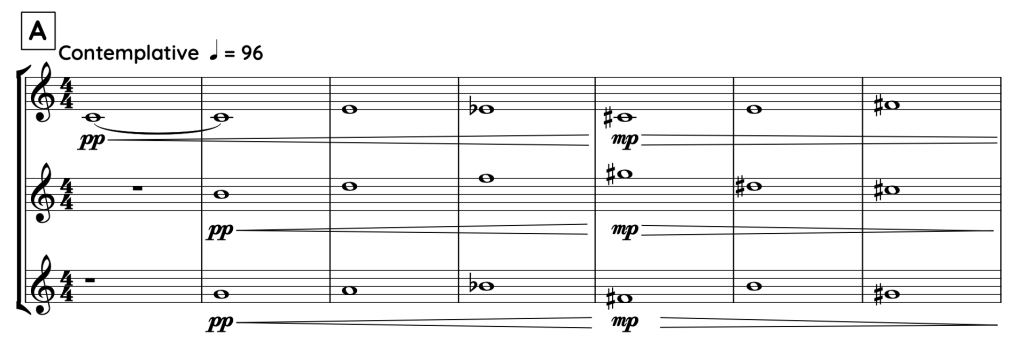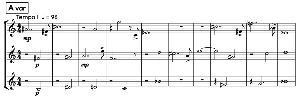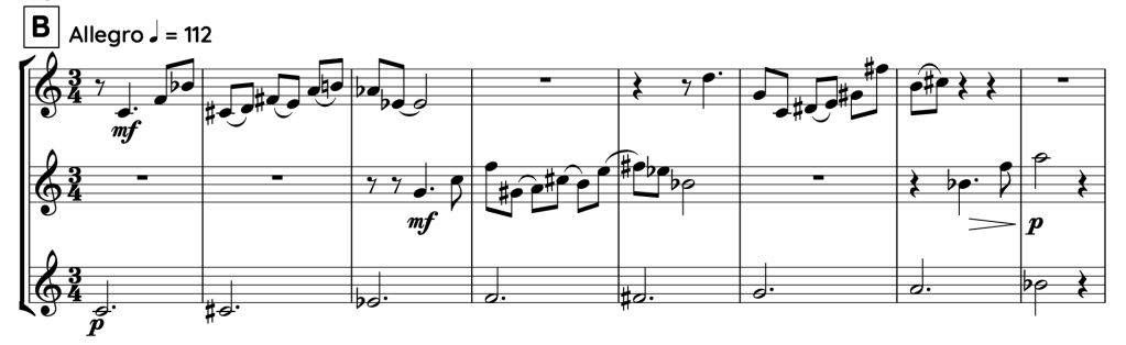 For our MapLab example, the chorale-like chordal setting of the trichords we’ve already seen will be the serene opening and ending material. Imitative contrapuntal setting of the row in a faster tempo and much faster pace make the contrasting middle. (Many classic three-part forms, by the way, are the converse, fast – slow – fast.)