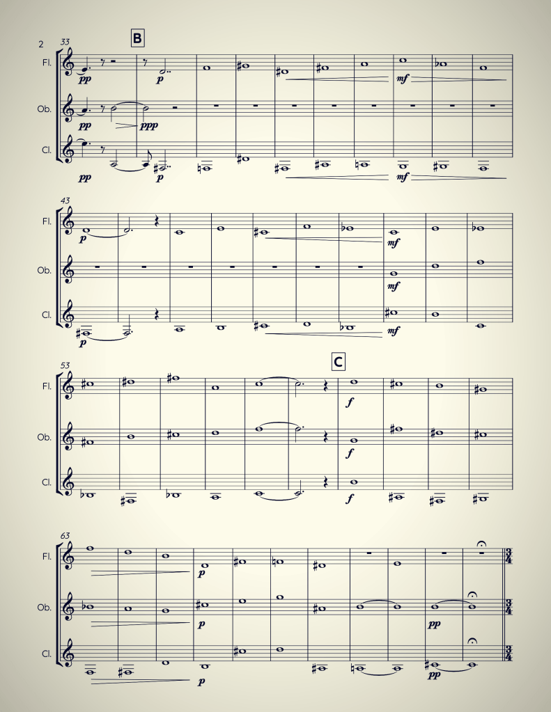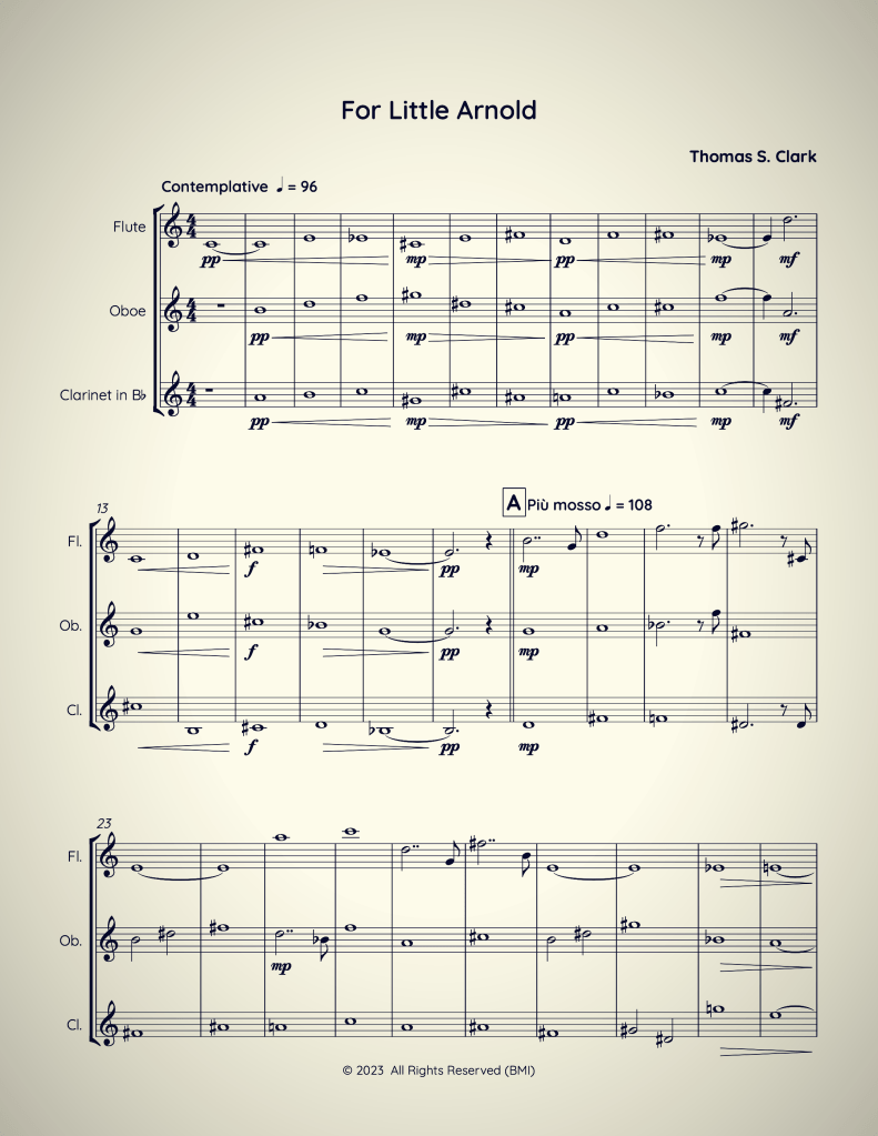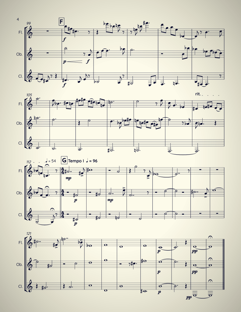 My scoring will emphasize use of those rich low registers of the flute and clarinet. Many chords will be voiced with oboe on top, flute in the middle, and clarinet lowest. Nonetheless, the score will show them in standard score order with flute at the top. Also, the clarinet is a Bb transposing instrument. That means in the score and player’s part, a written C will sound one whole step lower as a concert Bb. When I want, say, an F to sound, the clarinet part will show a written pitch one whole step higher, G.