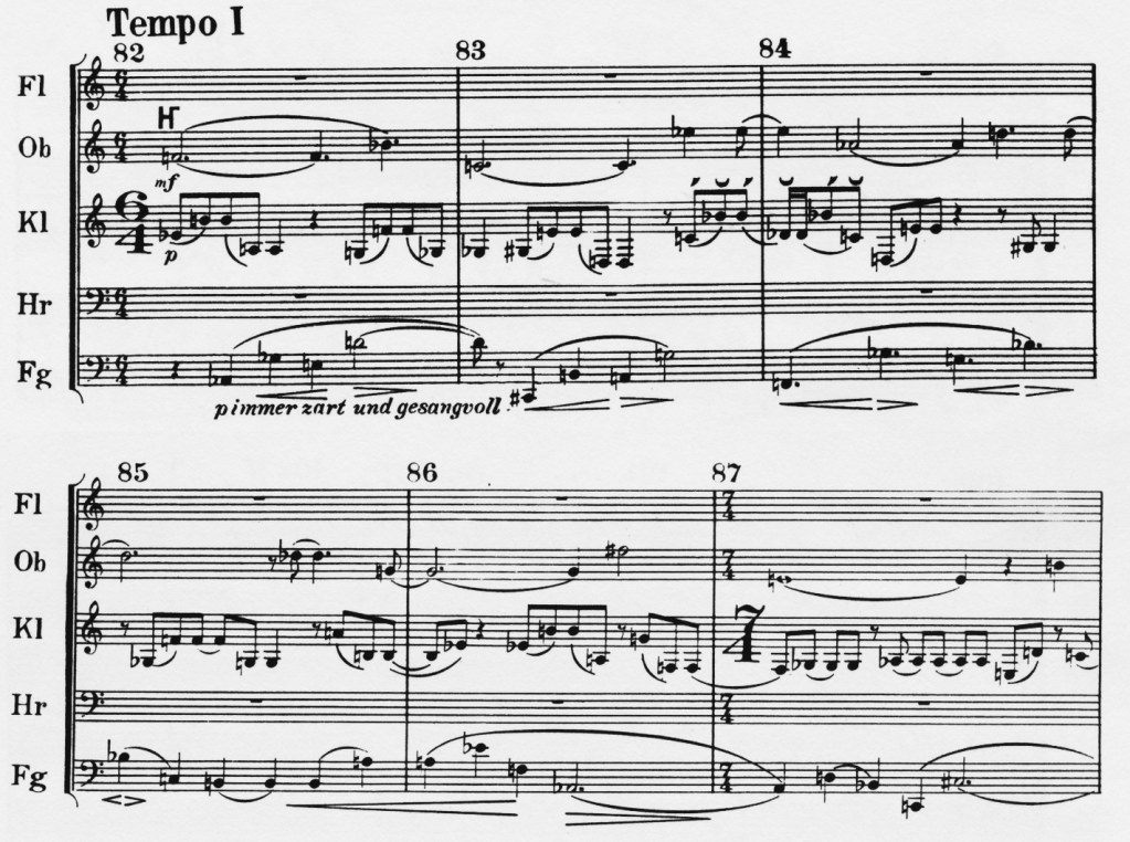 The third section brings back but alters the opening’s two lines, moved from horn and bassoon to oboe and bassoon, with the addition of a third contrapuntal voice in the clarinet.