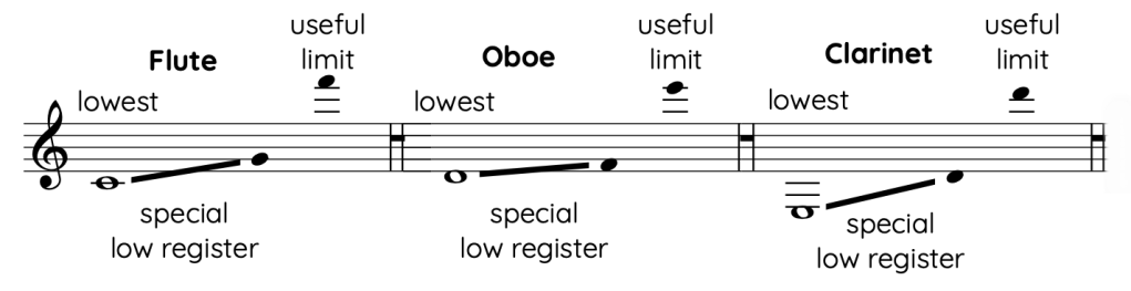 Get to know your chosen instruments, not only their overall range but also the particular characteristics of sub-registers. For orchestral string instruments, it is good to know their open string tunings and recognize those strings’ different qualities; the lowest string of each instrument is thicker and produces a thicker, grittier timbre. For my chosen three, flute and clarinet have wonderfully rich, dark lower registers, while the lowest few pitches of the oboe’s range are squawky. Each of the three instruments have upper ranges that thin a bit in timbre but can be elegant or powerful.