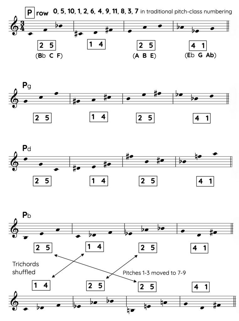Note: if you’re wondering how I pulled the lower line of dotted-half-note steps from the row, I didn’t. It is free counterpoint for a simple supporting “bass line.” Those pitches are drawn from the trichords expressed above them, as unison or octave “doubling” of single pitches from the upper lines.