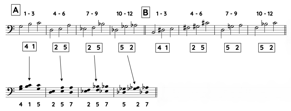 For our example in this lab, we’ll work instead with trichords, each a group of three pitch classes making a three-note array and set of three intervals. Here is such a row (A) and a slight variation of it (B):